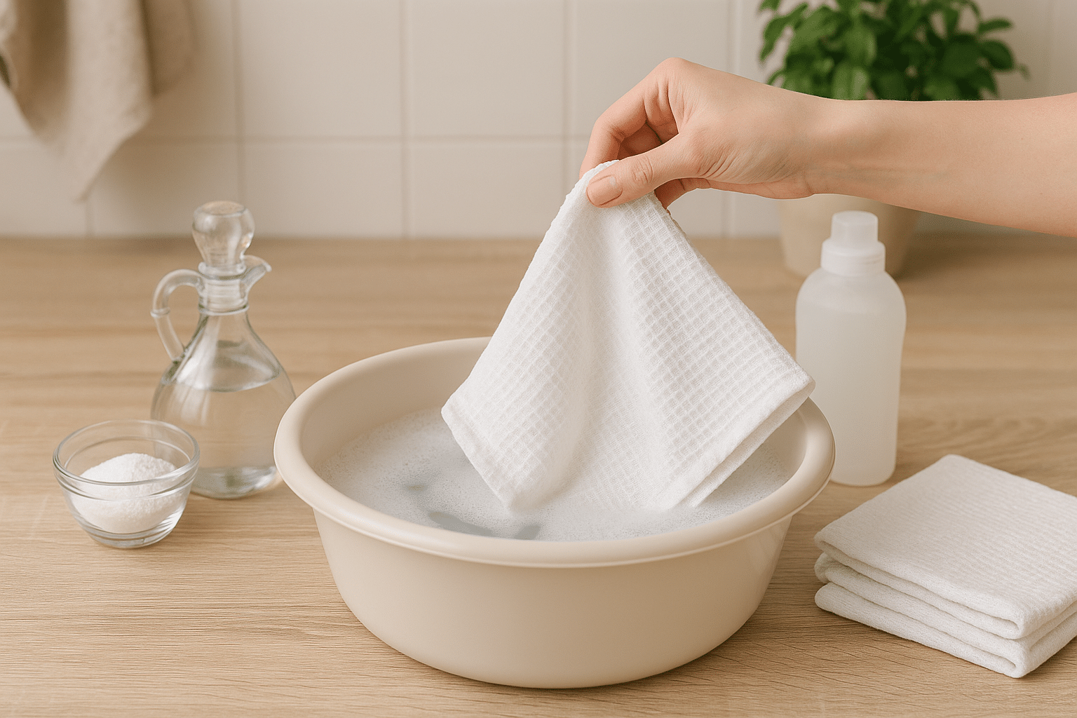 O caminho mais seguro para deixar Pano de prato branquinho é começar pelo pré-tratamento. Para encardido comum e amarelado, prepare uma solução com água morna (não fervendo) e percarbonato de sódio (alvejante sem cloro). Ele libera oxigênio ativo e ajuda a clarear sem a agressividade do cloro. Use cerca de 1 colher de sopa para cada litro de água, dissolva bem e deixe o pano de molho por 30 a 60 minutos. Se estiver muito encardido, você pode estender para até 2 horas, observando o tecido.